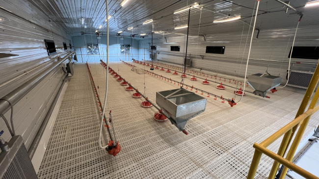 清粪机启动时,将每层鸡粪输送到机头端的横向输送带,由横向输送带输送至集中处理区域(存粪棚),完成清粪工作。粪便每天清除至舍外,保证棚舍内空气质量达标。