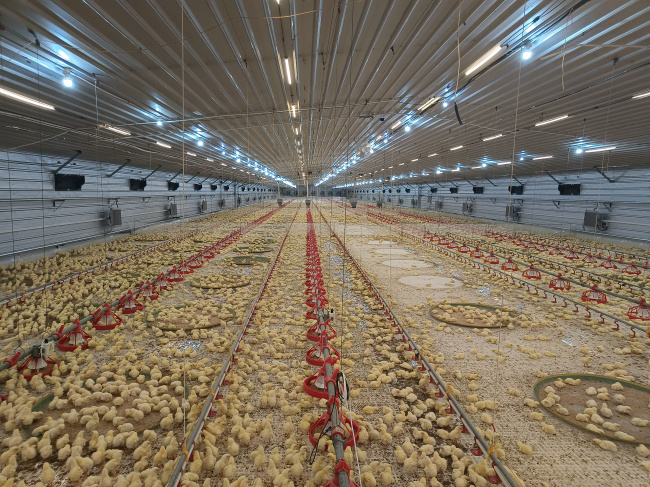 灯光使用LED养殖灯,采用全塑外壳。使用恒压电源集中供电,48V低电压,调光方便快捷。蓝暖光一键切换,出栏时使用蓝光,可以避免鸡群受惊,造成损伤及死淘。