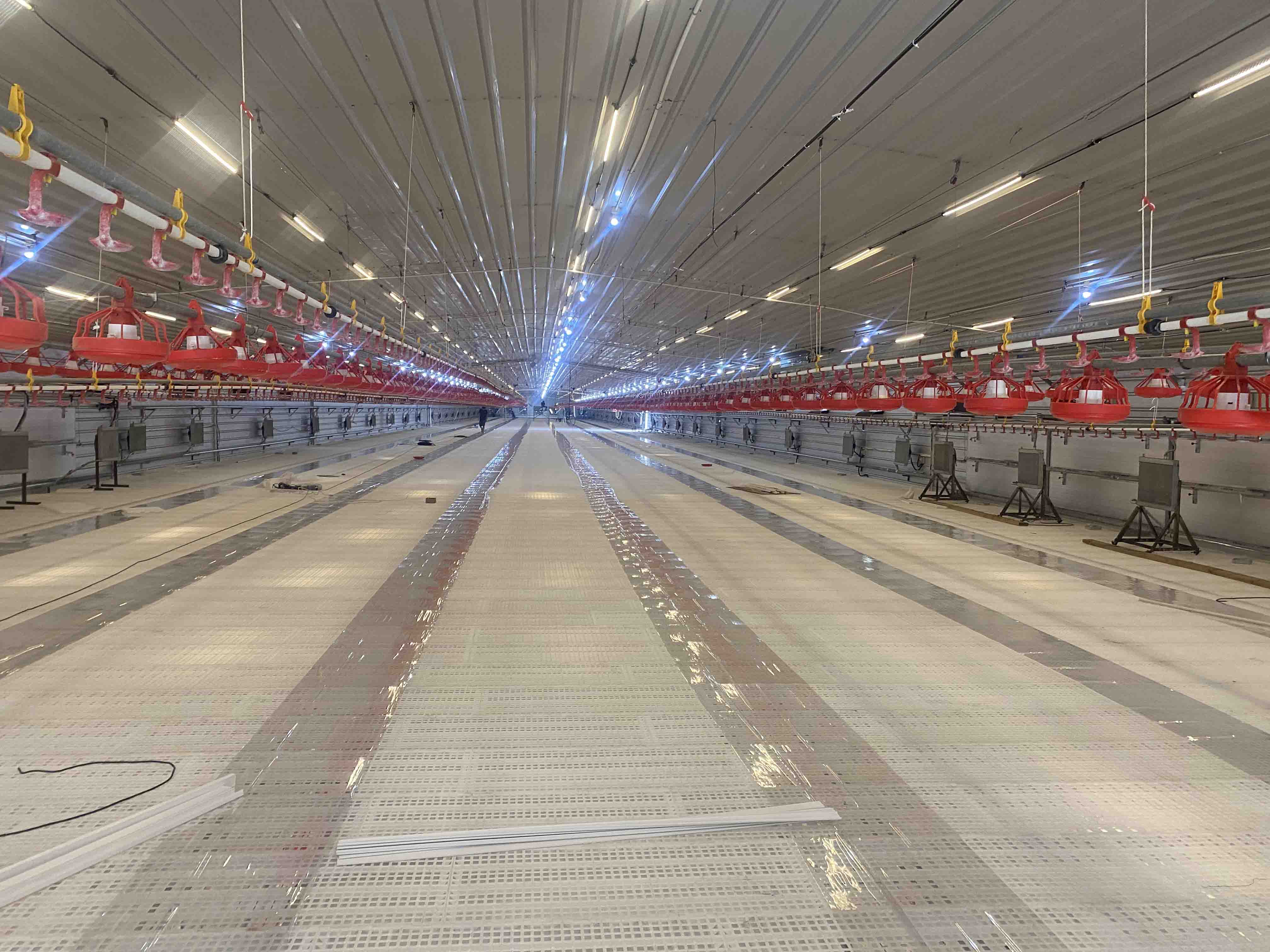 灯光使用LED养殖灯,采用全塑外壳。使用恒压电源集中供电,48V低电压,调光方便快捷。蓝暖光一键切换,出栏时使用蓝光,可以避免鸡群受惊,造成损伤及死淘。