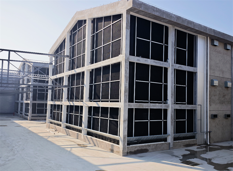 在禽舍尾端设置除臭间,将禽舍内排出的尾气集中收集,通过三级除臭的方式,达到除尘、除臭、空气净化。一级;通过设置PP滤网,以水洗为主除尘、及较大的绒毛,二级;在PP滤网后端设置次氯酸雾化装置,达到除臭、尾气净化消毒的作用,三级;在次氯酸雾化后端设置3D除臭网,增加臭气去除效率,气液分离的效果。